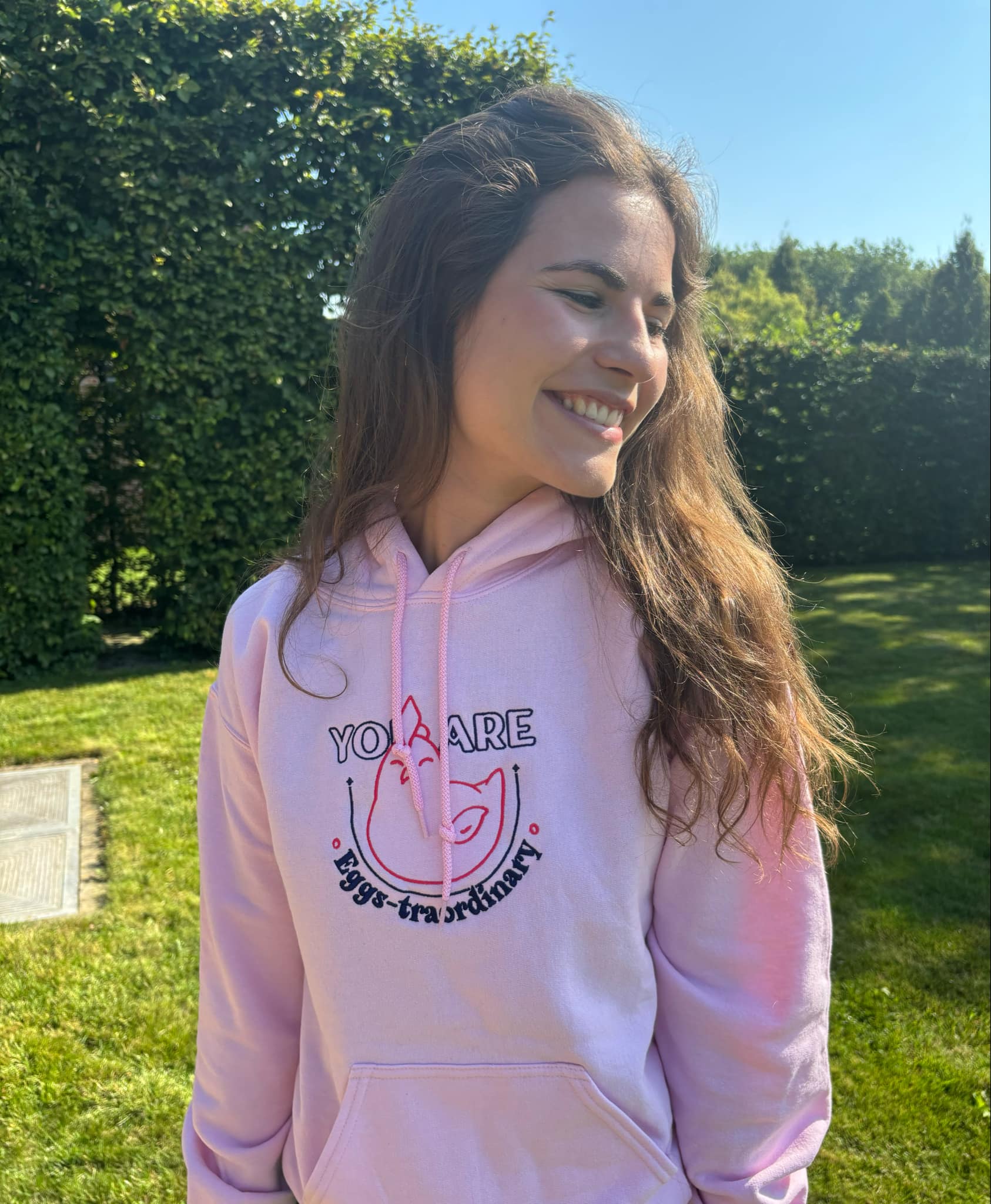 I designed this sweater for a friend of mine. I asked her for some prompts and she wanted a pastel pink color and something about chickens. So I drew a chicken and added an egg pun to give the chicken some relevance. The design is embroidered on a sweater.