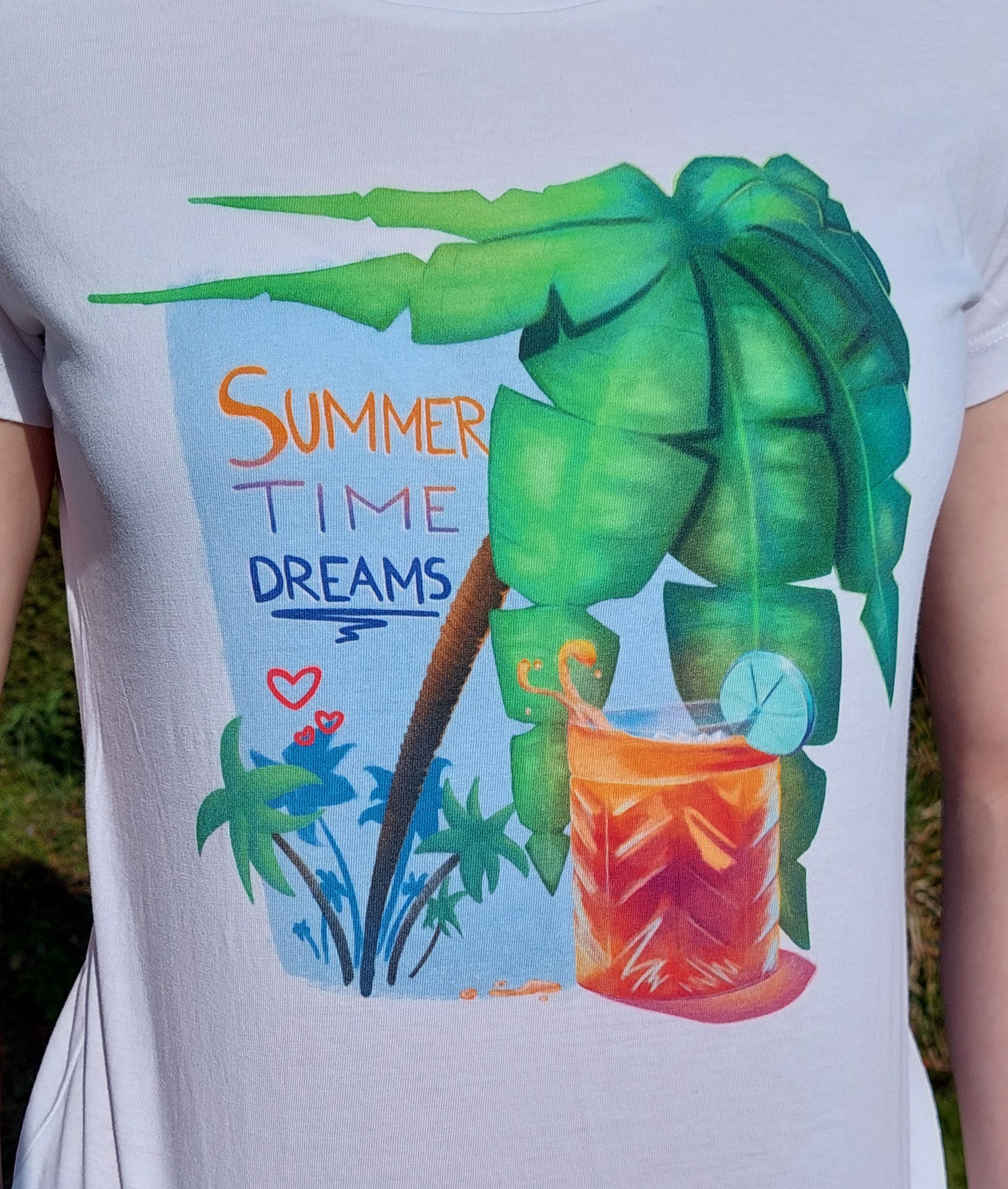 This is a summer T-shirt I made as a gift. I painted a scene which reminded me of summer vibes for the front of the T-shirt. On the back I added my signature, proof of its authenticity.