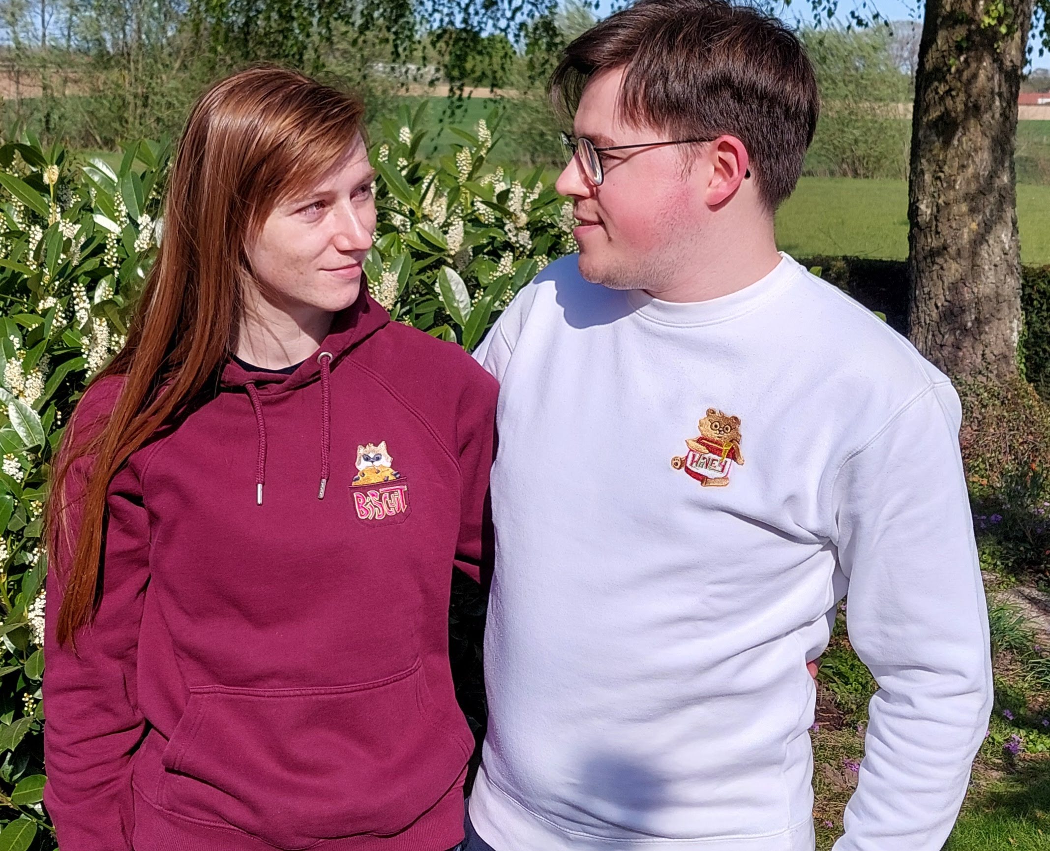 This pair of embroidered sweaters symbolizes my boyfriend and me and was an anniversary gift. One features a raccoon nibbling on a biscuit and the other a bear holding a jar of honey. Both have a honey-like heart on the back.